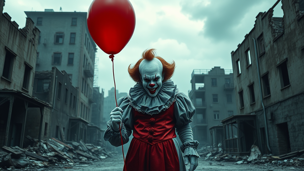 A menacing Pennywise-like clown holding a red balloon stands amid a dystopian, post-apocalyptic landscape with crumbling buildings, capturing the eerie atmosphere reminiscent of an IT movie scene. The setting is rendered in photorealistic detail, showcasing the desolation and threat in stark contrast to the clown's sinister grin and vibrant balloon.