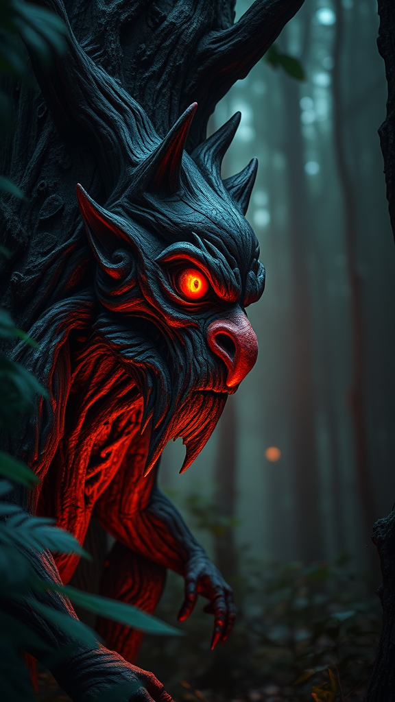A menacing wood creature with a glowing red eye emerges from the shadows, its form sculpted with intricate filigrees and textured bark, capturing the essence of a mysterious jungle. This entity stands with hyper-realistic detail akin to the works of Filip Hodas and Natalia Rak, its presence both anthropological and otherworldly. The forest atmosphere encapsulates a dark, Lovecraftian vibe, where a creepy man with a striking red nose seems to meld seamlessly into the surrounding foliage. His expression is eerily lifelike, a blend of colorful woodcarvings reminiscent of ZBrush artistry. The scene is illuminated by a dreamlike luminescence, drawing inspiration from frogcore aesthetics and characterful animal portraits, rendered in stunning hyper-realistic detail typical of DAZ3D style. Every inch of the composition reveals a masterpiece in 32k UHD, combining hyper-detailed rendering with a sense of unease and wonder, inviting curiosity yet evoking a profound sense of eerie enigma in the darkened forest.
