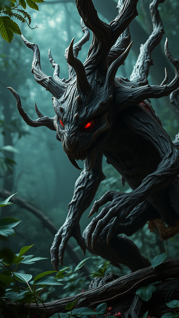 A menacing woodland creature emerges, its gnarled form resembling twisted branches and ancient bark, with a piercing, glowing red eye casting an eerie light. Designed in the hyper-realistic style of Filip Hodas, the creature is set against a mysterious, dense jungle backdrop. The scene is meticulously detailed, capturing each crevice and texture of its bark-like skin. Influences of DAZ3D's lifelike rendering can be seen in the creature's intricate anatomy, while the surreal touch of Sandy Skoglund introduces a subtle, dreamlike quality to the surrounding flora. Natalia Rak's vibrant palette adds an unexpected splash of color to the scene, creating a stark contrast with the creature's dark, looming presence. The setting evokes a sense of ancient mystique, an anthropological exploration into the depths of an enigmatic jungle, where nature’s secrets lie hidden.