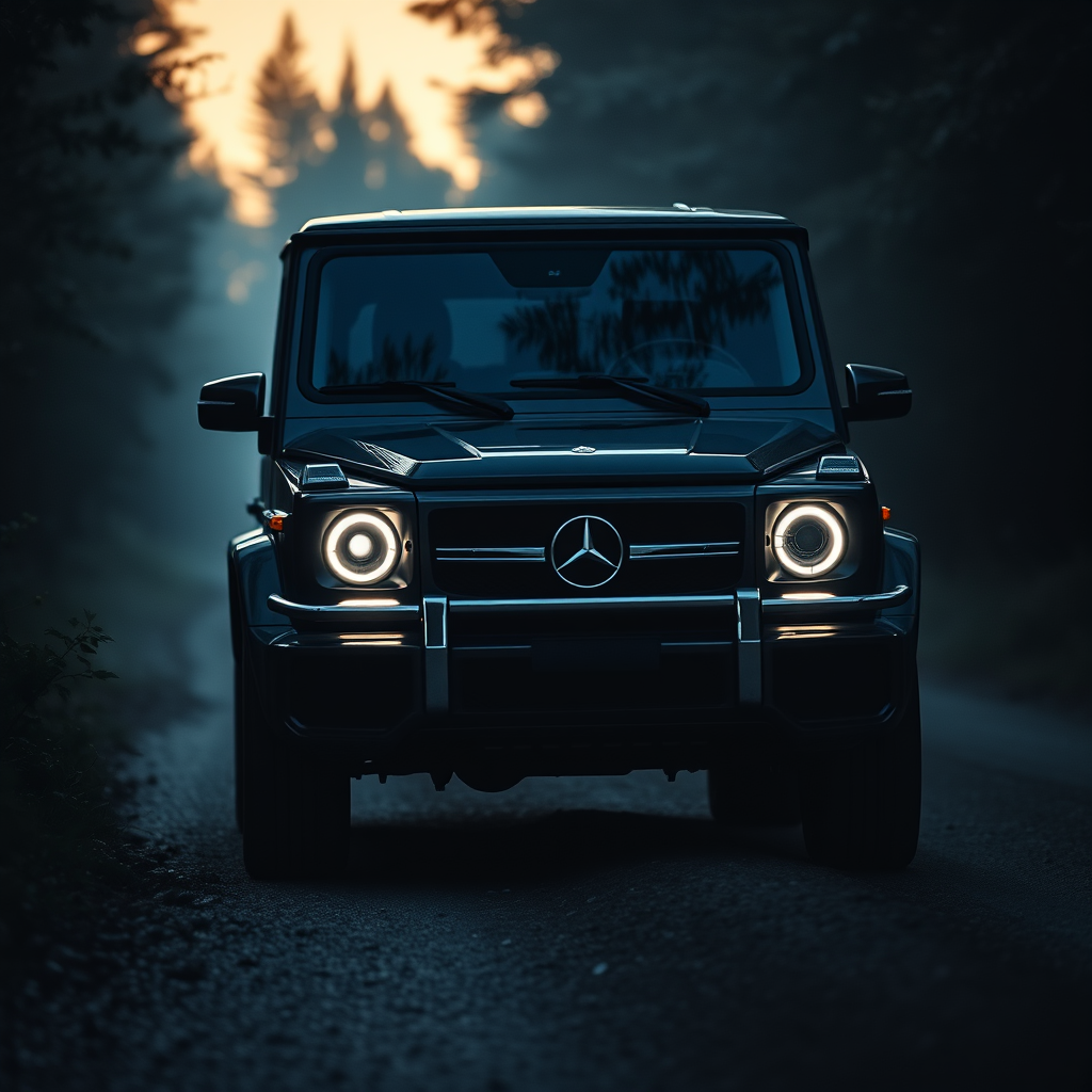 A Mercedes-Benz G-Class SUV navigates through a dense forest, its headlights piercing the misty twilight in the style of dark modernism. The scene is imbued with an urban-inspired flair, captured in 32k UHD resolution. Atmospheric lighting heightens the moodiness as shadows dance among the trees. The professionally color-graded scene adds depth and richness, enhancing the vehicle's sleek lines and the natural surroundings.