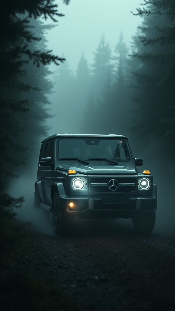 A Mercedes Benz G-Class SUV navigates through a dense forest, its headlights cutting through the mist, enveloped in the style of dark modernism with an urban edge, captured in ultra-high-definition clarity of 32k. The scene is bathed in atmospheric lighting, casting dramatic shadows and enhancing the moody ambiance. The color grading is professionally done, balancing rich contrasts and deep tones to heighten the sense of mystery and intrigue.