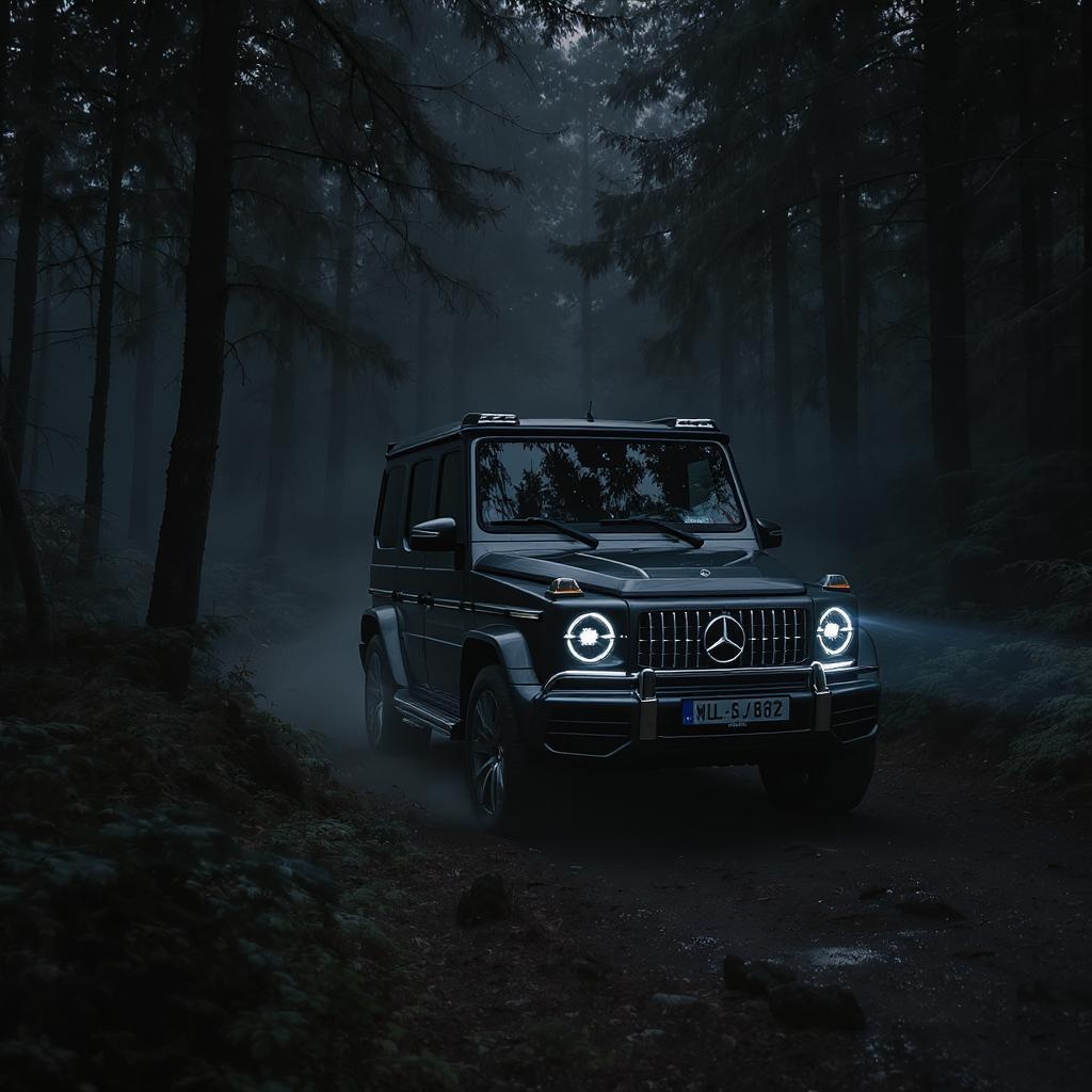 A Mercedes-Benz G-Class SUV navigates through a dense forest, headlights cutting through the misty air, rendered in a dark modernism style with an urban twist. The scene, captured in stunning 32k UHD, embodies atmospheric lighting and is professionally color graded to enhance its moody aura. The forest's shadows play intricately with the vehicle's polished surfaces, exuding an aura of serene sophistication amidst the untamed wilderness.