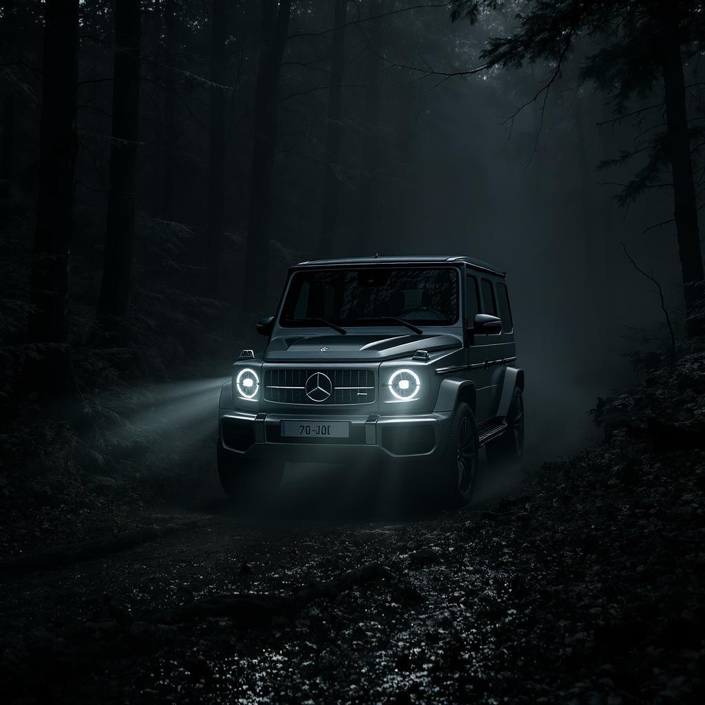 A Mercedes Benz G-Class SUV navigates through a dense forest, its headlights cutting through the mist and casting elongated shadows in the style of dark modernism. The scene exudes urban influences, captured in stunning 32k UHD. The atmosphere is charged with dramatic, moody lighting and expertly enhanced with professional color grading to intensify the depth and contrast of the environment.