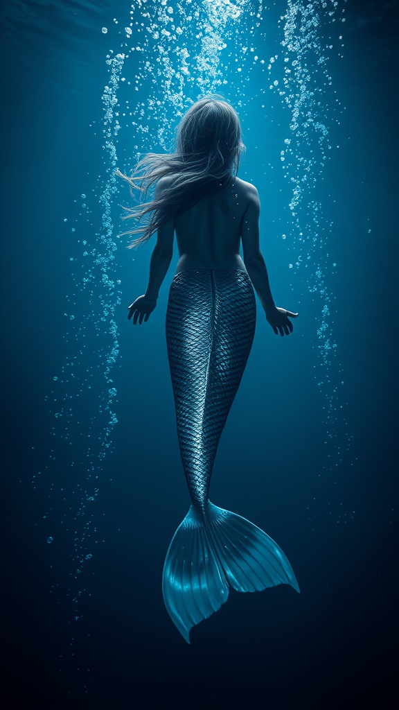 A mermaid gracefully swims through the shimmering depths of the ocean, surrounded by a cascade of rising air bubbles. Her iridescent tail glints in the ambient glow of light blue hues, creating a breathtaking contrast against the dark underwater background. The scene is captured in stunning photorealism, with intricate details visible even in the play of light across her scales. Illuminated by a soft, cinematic lighting that casts gentle shadows, the atmosphere is serene and otherworldly. The high-definition, 8K resolution enhances the texture of her skin and the movement of her hair, as the faint floodlight reveals the boundless mystery of the ocean's embrace.