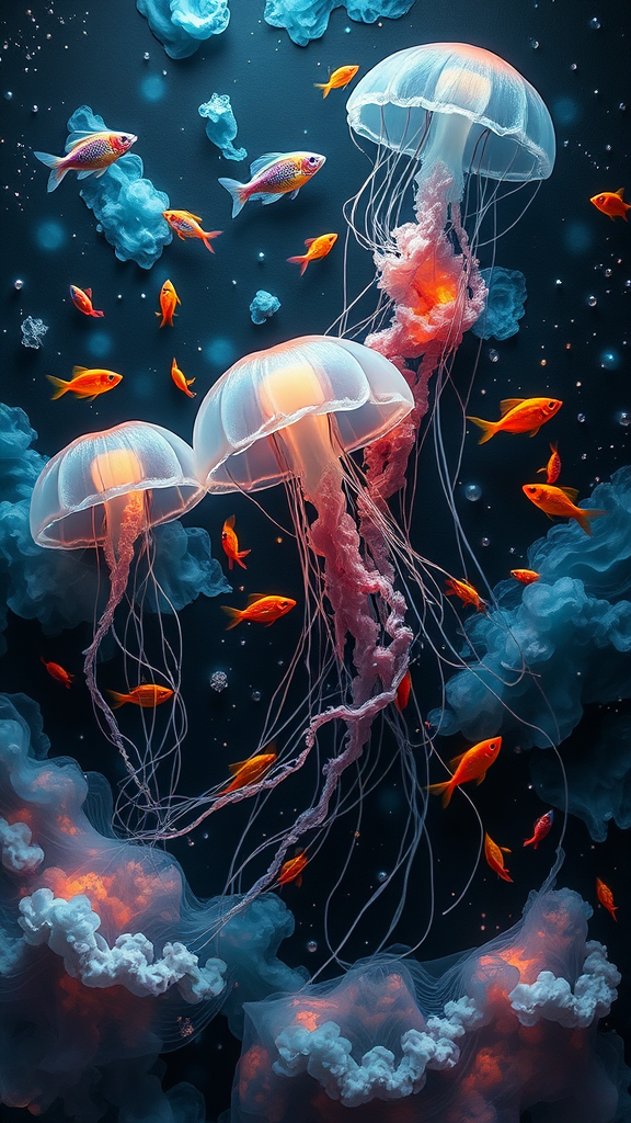 A mesmerizing 3D painting depicting luminescent jellyfish surrounded by vibrant, colorful fish floating amidst ethereal clouds, rendered in a dark, chaotic style with hues of light black and shimmering aquamarine. The scene is fluid and gestural, animated as if in a dynamic dance, reminiscent of flickr's visual storytelling. Gossamer-like fabrics add an otherworldly texture, creating a sense of movement and depth, while the entire scene unfolds in a site-specific artwork designed to captivate and intrigue.