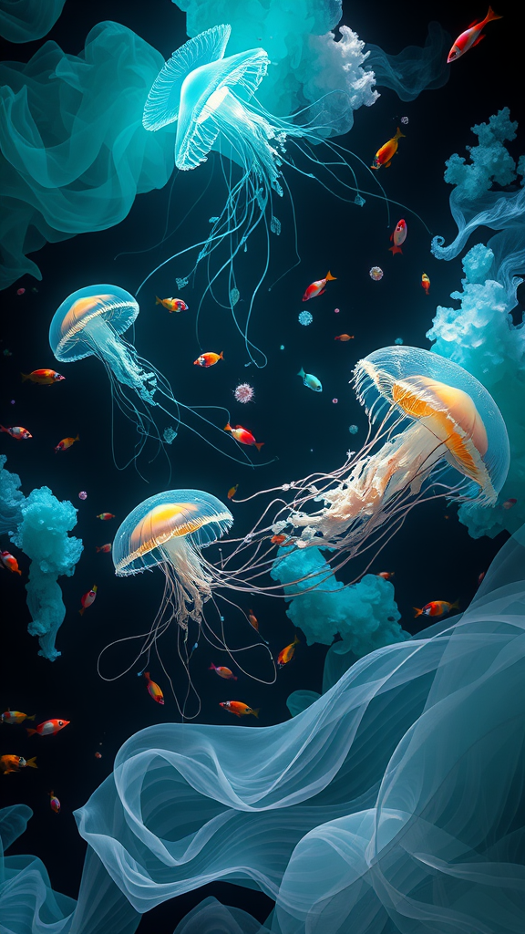 A mesmerizing 3D painting featuring ethereal jellyfish gliding through a surreal underwater world, surrounded by vibrant, colorful fish and wisps of cloud-like formations. The scene is captured in a dark and chaotic style, with a palette of light black and luminescent aquamarine hues. Animated elements bring the artwork to life, reminiscent of flickering gifs. The setting feels like a site-specific installation, with flowing, gossamer-like fabrics undulating gracefully, creating a fluid and gestural atmosphere. The essence of a dynamic, ever-changing aquatic realm is encapsulated in this captivating visual tapestry.