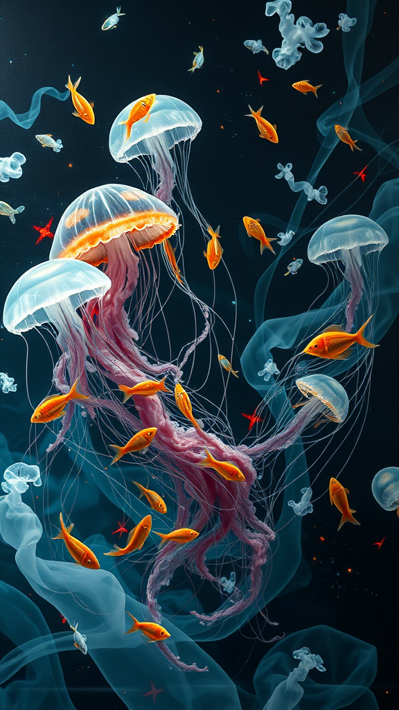 A mesmerizing 3D painting showcasing ethereal jellyfish intertwining with vibrant, colorful fish swimming through wisps of clouds. The scene is set in a dark and chaotic atmosphere, where light black and light aquamarine hues dance fluidly across the canvas. The animated gif brings the artwork to life, with fish gliding gracefully amidst translucent jellyfish tentacles. Site-specific elements amplify the sense of immersion, as if stepping into an underwater dreamscape. Gossamer fabrics float effortlessly in the scene, adding layers of delicate motion. Rendered in a fluid and gestural style reminiscent of flickr’s artistic community, the piece captures a sense of dynamic beauty and serene chaos.