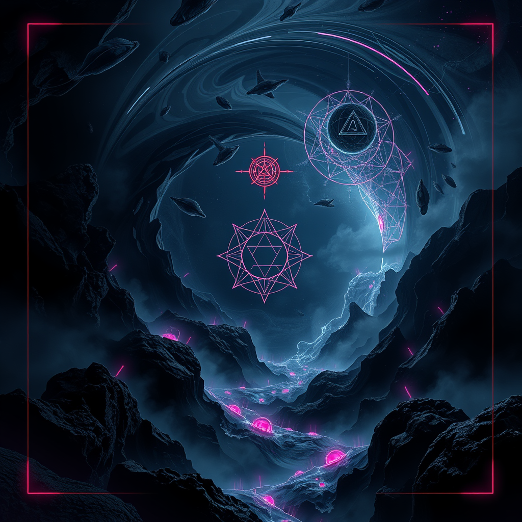 A mesmerizing album cover design featuring an enigmatic techno landscape, blending dark, swirling elements with subtle neon glows. Ethereal, abstract forms emerge from shadowy depths, inviting contemplation and absorption. Mysterious symbols hover amidst atmospheric haze, hinting at secrets within the beats. The overall aesthetic exudes a sleek, futuristic vibe, with intricate details and contrasting textures that evoke a sense of immersive exploration and deep sonic resonance.