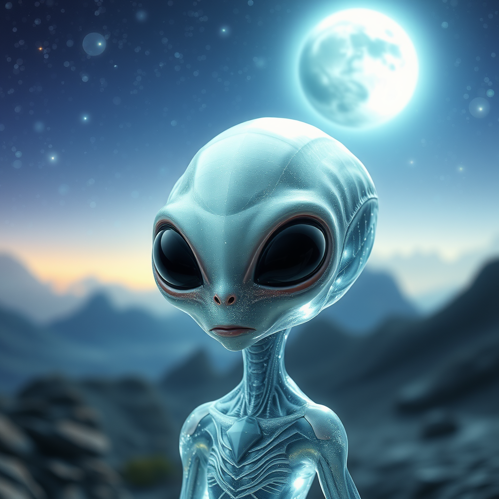 A mesmerizing alien with crystalline skin stands under a starry sky, its two large, glossy black eyes deeply captivating. In the backdrop, a mystical planet looms, surrounded by a halo of ethereal light. The atmosphere is infused with hyper detail and volumetric lighting, casting intricate reflections off the alien's surface. An unrealistic, fantasy-like rendering imbues the scene with an otherworldly glow, reminiscent of a dream-like universe, as soft waves of light flow across the alien's body in intricate patterns.