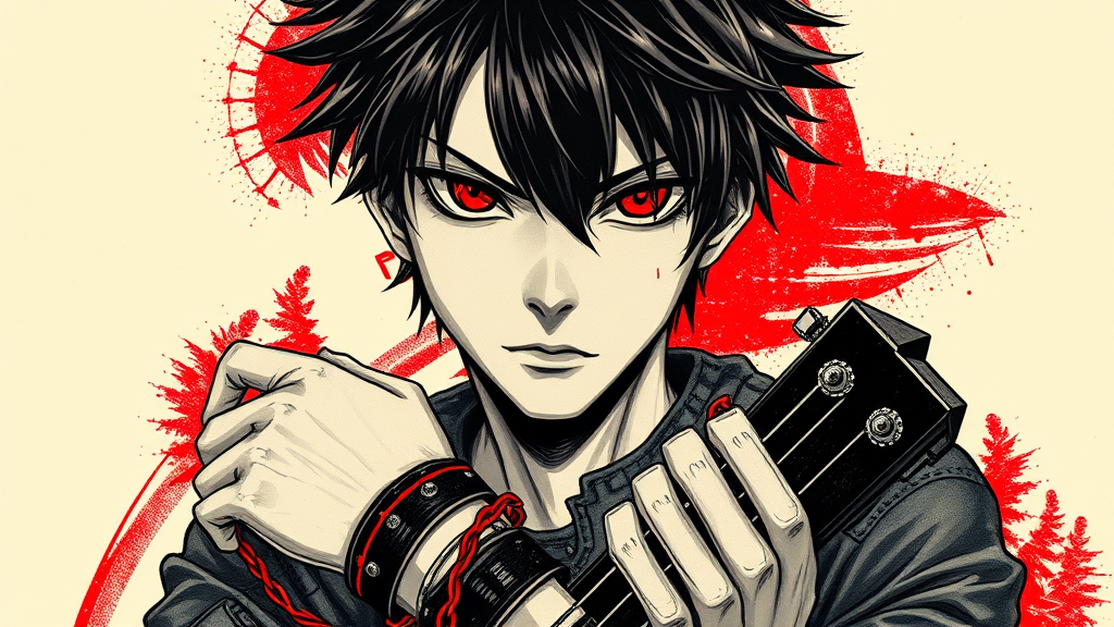 A mesmerizing and detailed portrait of a stoic anime boy with piercing eyes, masterfully etched in a drypoint style reminiscent of Davinci's finesse. He's holding a modern, sleek guitar, symbolizing his connection to rock music. His edgy spikes and punk-inspired wristbands add a rebellious flair. His dark black hair, with subtle undertones of neon red, completes his enigmatic aura. The boy exudes a cool attitude and mysterious charm, set against a backdrop of hot blacks and red accents that capture the essence of an electric, captivating scene.