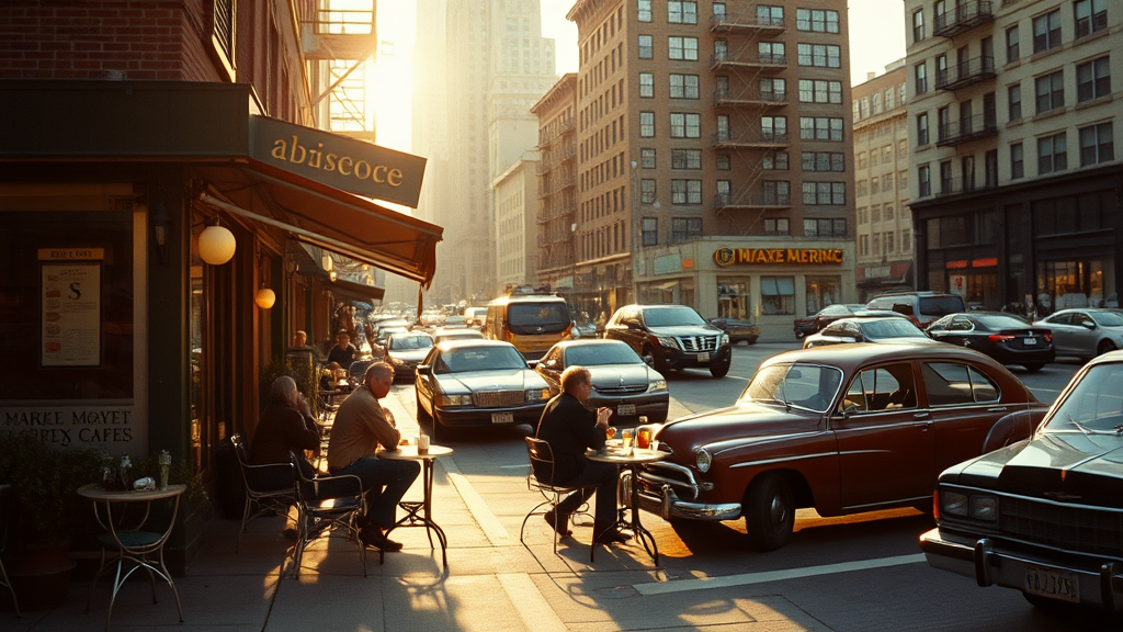 A mesmerizing and evocative 1970's New York street cafe scene captured in a nostalgic and cinematic manner, paying homage to the golden age of film photography. This vintage setting depicts the lively urban atmosphere with patrons savoring their coffee at outdoor tables, amidst the flow of classic automobiles and charming retro architecture. The photograph is skillfully crafted using a Leica M3 rangefinder camera coupled with a Summicron 35mm f/2 lens, celebrated for its precision and exquisite color rendering. Shot on Kodak Portra 400 film, the image exudes a warm and timeless color palette that amplifies the ambiance. The photographer adeptly uses a shallow depth of field at an aperture of f/2.8, beautifully isolating the cafe and its guests from the dynamic city backdrop. With an ISO of 400 and a shutter speed of 1/125 sec, the scene captures an ideal blend of light and motion. Enhanced by gentle, diffused sunlight filtering through the iconic New York skyline, the scene is bathed in warm, golden hues that accentuate the rich textures of the brick buildings and cobblestone streets.