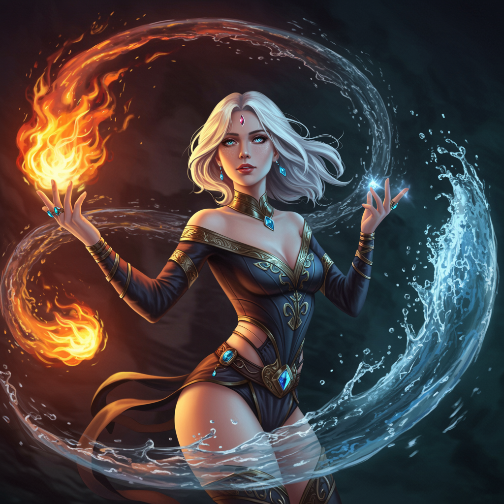 A mesmerizing and graceful female wizard is poised in an enchanting dark fantasy realm, her form exuding elegance as she casts an intricate spell. Elemental energies spiral around her, creating a captivating display. She wears a stunning, off-shoulder outfit adorned with intricate patterns and embellished with elaborate rings that glisten with magical energy. Her fair skin glows softly under a mystical, ethereal light, highlighting her striking blue eyes and a bewitching smile. Elements of fire, water, wind, and ice all harmoniously intermingle around her, forming a dynamic and breathtaking composition—a true masterpiece in ultra high resolution.
