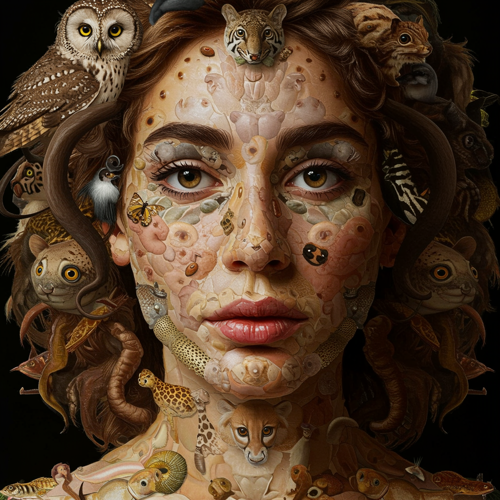 A mesmerizing and intricate portrait where the face of a person emerges from a vibrant tapestry of different animal species, each creature thoughtfully positioned to form the unique contours of facial features, varying skin tones, and the texture of hair. The eyes might be crafted from the soft plumage of owls, the nose subtly shaped by the gentle curves of small mammals, while lips come alive through the delicate arrangement of colorful fish scales. A cascade of hair could be fashioned from flowing manes of wild horses and lush fur of forest creatures, seamlessly blending into the rich hues of reptilian skin. This surreal composition not only captures the essence of the person but also reflects the intricate beauty and diversity of the animal kingdom, echoing the imaginative essence of Giuseppe Arcimboldo's art, yet with a unique twist that invites closer inspection into the harmonious convergence of humanity and nature.