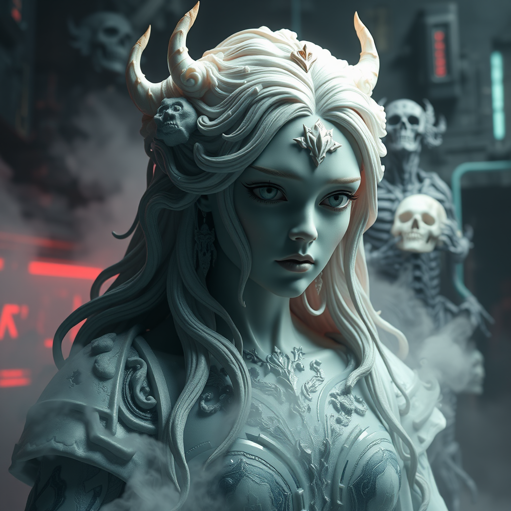 A mesmerizing and intricately crafted sculpture of a female necromancer, carved from marble and jade, enveloped in ethereal volumetric fog. The scene captures hyperrealism and breathtaking details, utilizing cinematic lighting and ultra-realistic textures akin to Unreal Engine. Set against a cybernetic backdrop, the environment is stunning and expansive, designed with wide-angle CGI techniques. The piece exudes a blend of artistic styles, including digital art and painting influences, with elements reminiscent of anime and illustration. The focus remains on the haunting beauty and exquisite craftsmanship, while ensuring anatomical accuracy and balanced proportions for a captivating and immersive experience.