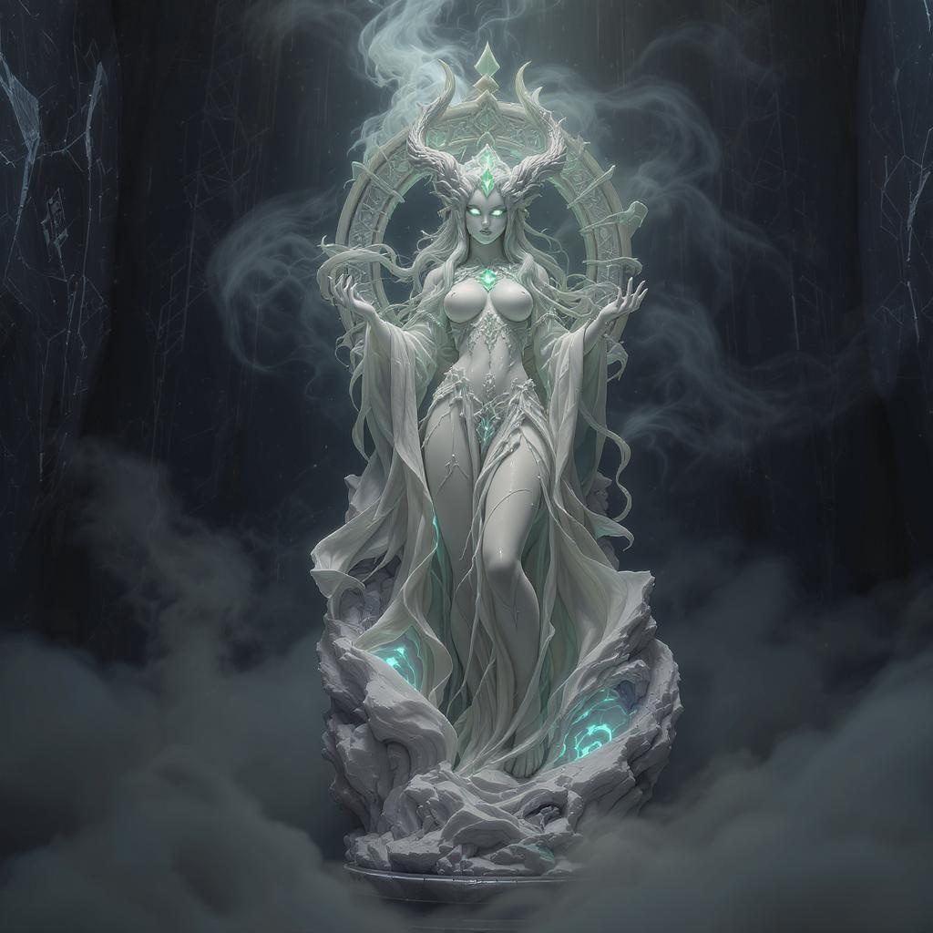 A mesmerizing and intricately detailed marble and jade sculpture of a female necromancer emerges from a mystical setting enveloped in volumetric fog. This hyper-realistic and breathtaking piece is crafted with the precision of Unreal Engine, showcasing ultra-detailed features against a cyber background. The cinematic lighting enhances the stunning environment, giving it a photographic quality that makes it feel alive. This wide-angle CGI scene is rendered in 3D with the finesse of octane, blending elements of anime and digital art to form a unique masterpiece. The necromancer's delicate features and elegant pose contrast beautifully with the mystical, ethereal atmosphere, making it a captivating visual experience without any distracting imperfections or distortions.