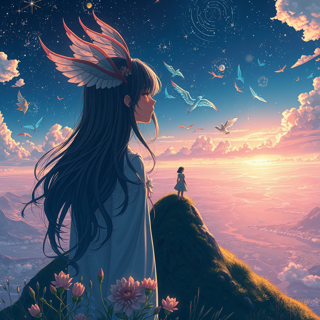 A mesmerizing anime-style depiction of a celestial girl standing solitary atop a hill, her detailed and stunning face capturing the serene beauty of her surroundings. The scene is rendered with intricate detail, vibrant colors, and a breathtaking, cinematic quality. The panoramic view showcases a fantastical landscape, reminiscent of Ghibli films, with artistic influences from Carne Griffiths and Conrad Roset, blending surreal elegance and delicate lines. The composition centers around the girl, evoking a sense of wonder and tranquility.