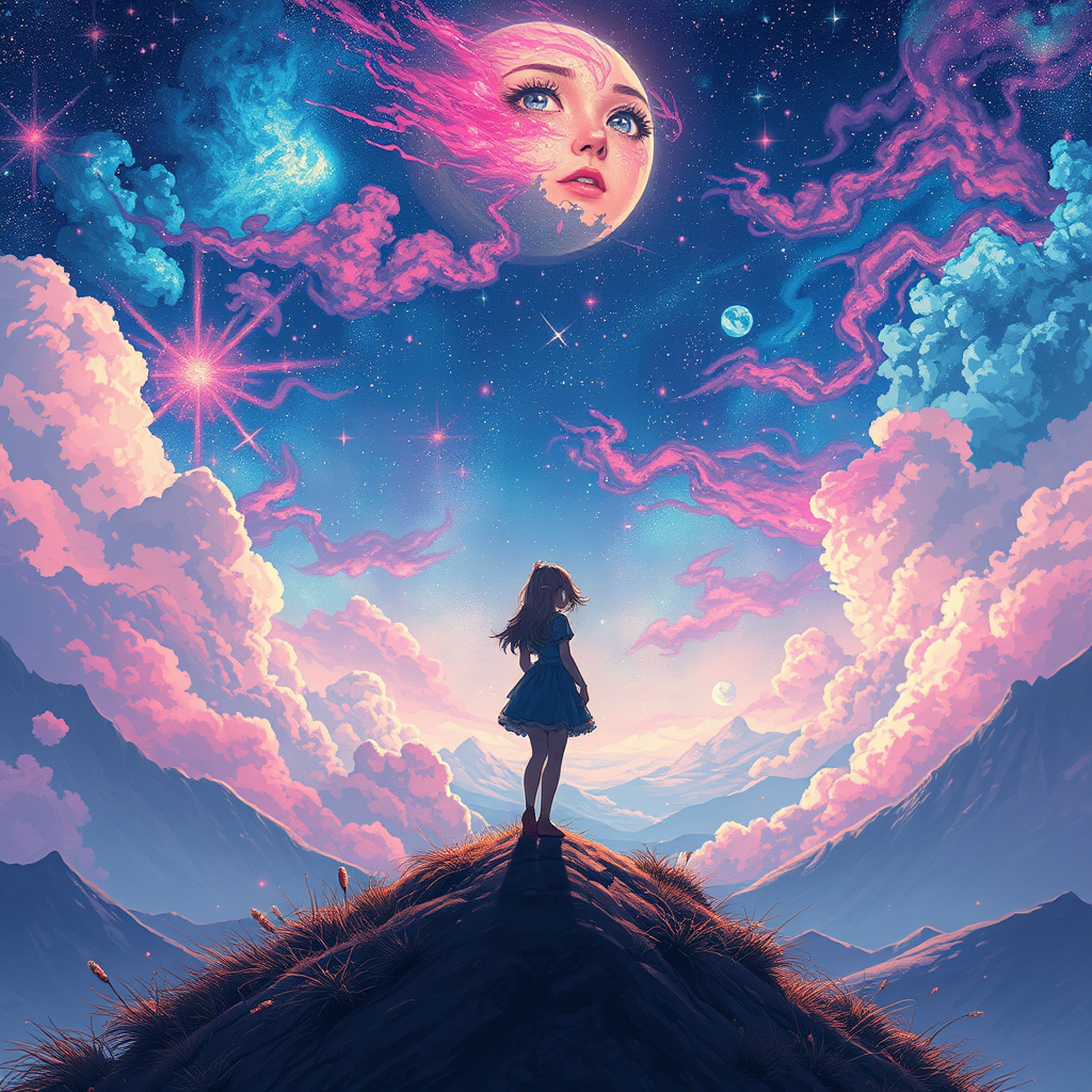 A mesmerizing anime-style depiction of a lone cosmic heroine poised atop a hill, her captivating and intricately detailed face radiating otherworldly charm. The scene unfolds like a key visual from a cinematic panorama, bursting with breathtaking vibrancy and intricate detail. The ethereal landscape, reminiscent of a Carne Griffiths and Conrad Roset collaboration with the enchanting essence of Ghibli, envelops the figure in an awe-inspiring tapestry of color and emotion.