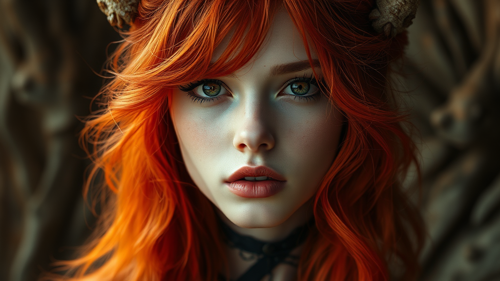 A mesmerizing art piece of a fantasy woman with vibrant red hair, captured in a realistic style with fawncore elements, utilizing black and amber tones. The composition features varied brushwork techniques highlighting distinctive noses, set against a palette of dark whites and light golds. The beauty of the scene is breathtaking, evoking awe and wonder, with subtle creative nuances adding depth to the core concept.