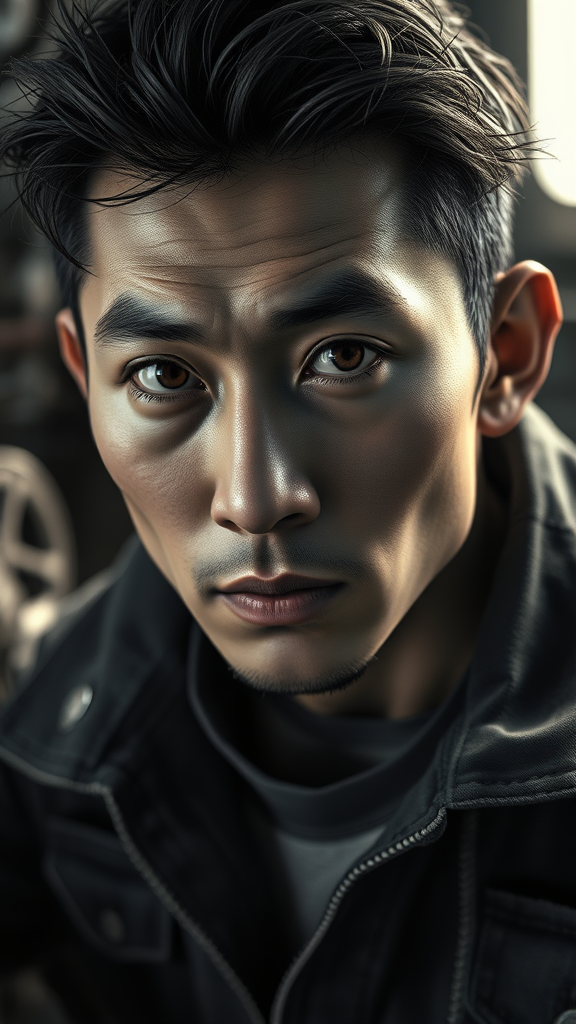 A mesmerizing artwork capturing a man in a breathtaking industrial mechanic setting, juxtaposing soft lustrous elements with the ruggedness of a harsh working environment. The scene is set in a fantastic location, showcasing a full-body action shot in 8k unity render. Intricate details are evident in the skin pores and detailed irises, with very dark lighting casting heavy shadows. The face is meticulously detailed, emphasizing smooth yet sharp focus. This digital painting is rendered with octane and designed for artstation, incorporating concept art techniques by artists like Artgerm, Wlop, and Ilya Kuvshinov. The Asian subject is portrayed in striking black and white, with a close-up on expressive features. The style blends cartoon and 3D elements, with attire reflecting industrial denim. The overall composition ensures high resolution and artistic integrity, avoiding any signs of low quality, distortion, or distractions like watermarks or signatures.