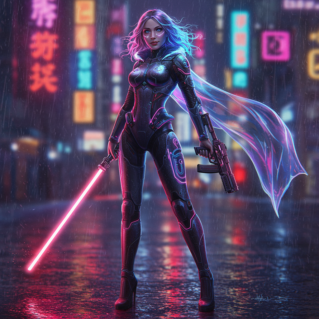 A mesmerizing artwork depicting a futuristic female warrior in a sci-fi setting, portrayed in a full-body shot with an 8k resolution. She dons sleek sci-fi armor adorned with vibrant neon lights, exuding an air of both allure and strength. Her captivating large eyes reflect her confidence and readiness to engage in battle. Set against the backdrop of a sprawling cyberpunk city, the scene is imbued with the ambiance of urban slow motion, rain glistening under neon lights. In her hand, she grips a laser saber and a cutting-edge sci-fi gun, while a transparent cape flows behind her, adding an ethereal quality. Her hair is a cascade of dynamic, multi-colored light, complementing the reflections and intricate details of her appearance. The realistic portrayal of her face shows her confidence with a subtle, alluring smile. She stands tall in high-heeled boots, embodying an essence of nostalgia paired with a modern twist. The artwork is a professional masterpiece inspired by the styles of Ed Binkley, Atey Ghailan, Studio Ghibli, Jeremy Mann, Gregory Manchess, and Antonio Moro, garnering attention on platforms like ArtStation and CGSociety. The composition is intricate, with sharp focus and dramatic lighting enhanced by lens flares, capturing the essence of a photorealistic painting without the distortions or anomalies often seen in digital creations.