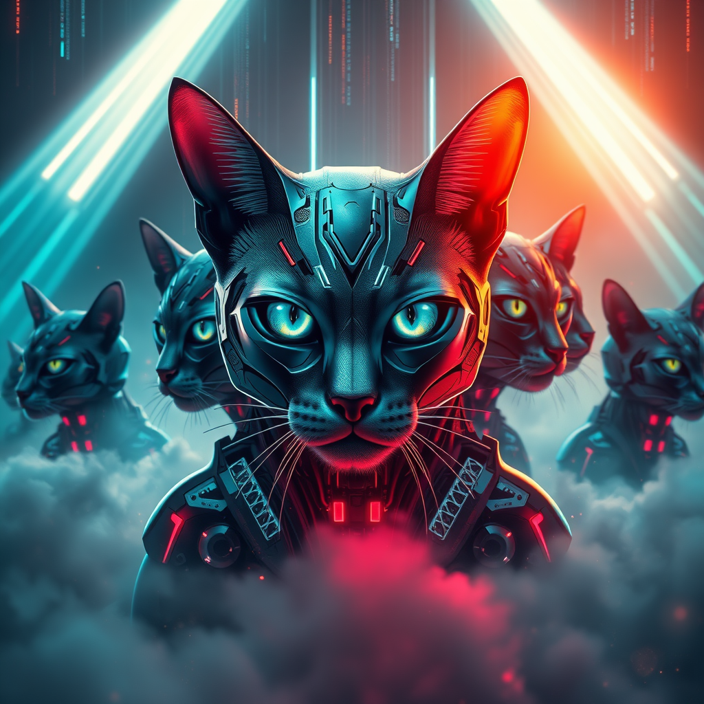 A mesmerizing artwork of a feline hacker in a futuristic cybernetic landscape, with a sleek, sharp face emerging from volumetric fog. The scene is illuminated by piercing godrays, creating dynamic high contrast with vibrant, vivid, and high saturation colors. The hacker is depicted with multiple heads and bodies, showcasing an enigmatic and multi-faceted presence. Inspired by the styles of Greg Rutkowski, Jesper Ejsing, Raymond Swanland, and Alena Aenami, the art is designed in a vertical orientation with a wide-angle perspective, capturing the intricate details of the cybernetic environment. The feline's eyes glow with intelligence, reflecting digital streams of data across the landscape, while the atmosphere buzzes with electric energy, featured on ArtStation.