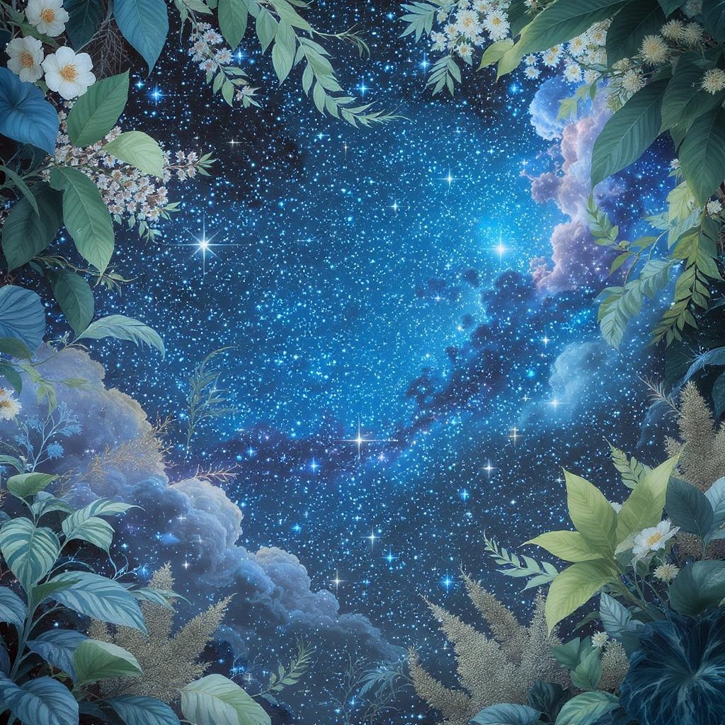 A mesmerizing celestial wallpaper featuring a harmonious blend of constellations and lush greenery, where twinkling stars weave through vibrant foliage, creating a dreamy tapestry of nebulae intertwined with delicate flowers and wispy clouds, evoking a sense of serene cosmic enchantment amidst nature's tranquil beauty.