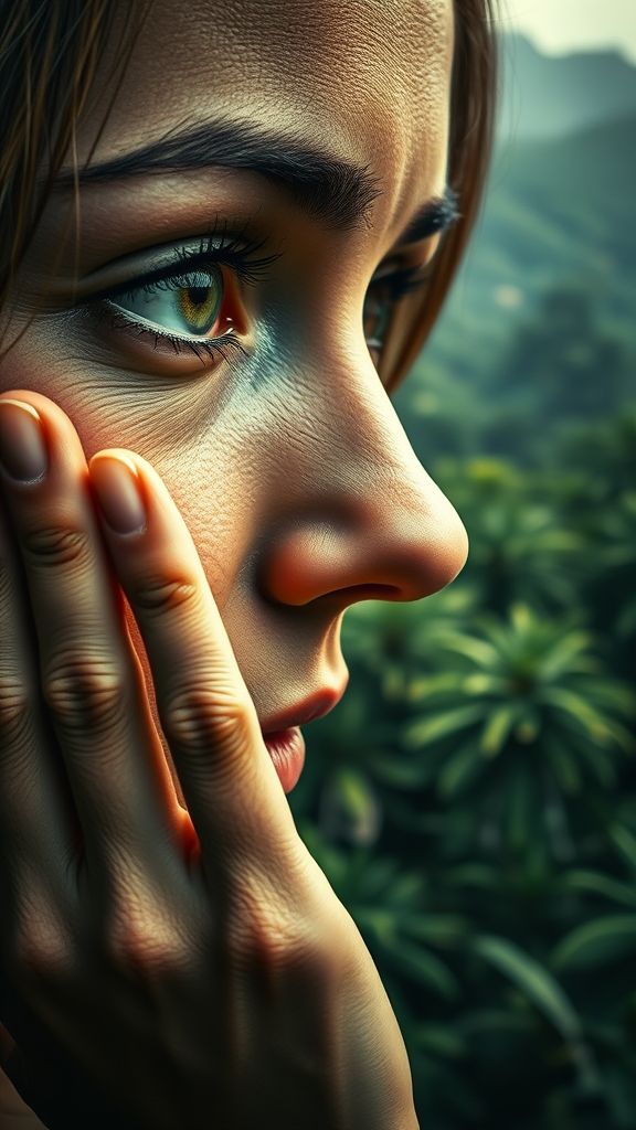 A mesmerizing close up of a woman gazing over a lush rainforest, her eyes shimmering with an ethereal allure, showcasing exquisite detail and ultra-high definition. Her enigmatic hands add an abstract touch with imaginative imperfections, such as missing or extra fingers and unusual anatomy, inviting a sense of surrealism. The image is characterized by intentional artistic quirks, including cropped elements and occasional blurriness, reminiscent of a vintage photograph with subtle jpeg artifacts. It possesses a dreamlike quality, evoking a sense of wonder while maintaining the core essence of an otherworldly bond between the woman and the rainforest, complete with a whimsical hint of imperfection.