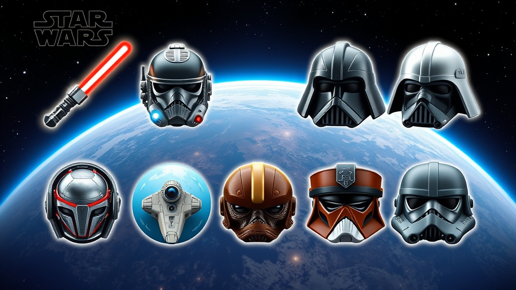 A mesmerizing collection of eight intricately designed Star Wars-themed emojis, each uniquely capturing iconic elements from the galaxy. The emojis are rendered with stunning 8k detail and octane precision, showcasing a variety of textures, colors, and lighting effects that make them vividly lifelike. These masterfully crafted emojis include a mysterious Jedi lightsaber, a whimsical astromech droid, an imposing Sith Lord helmet, a serene planet in a distant galaxy, a formidable starship, a mischievous alien creature, a legendary bounty hunter visor, and an enigmatic ancient artifact. Each emoji is a miniature work of art, blending realism with fantastical elements to evoke the wonder and excitement of the Star Wars universe.