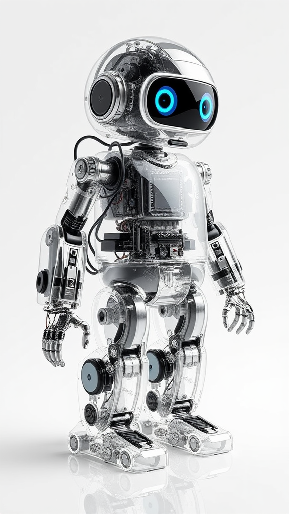 A mesmerizing concept design of an award-winning fully transparent robot with a polycarbonate body showcasing an intricate network of PCBs, wires, and electronics. The visually stunning display of technology sits against a pristine white background with reflections capturing both the gleam of glass and screen space, enhanced by a well-chosen color palette. This detailed, innovative piece of mechanical concept art includes artistic modifications such as deformed iris and pupils, creating a unique look. Despite the semi-realistic approach, the design maintains high quality in a monochrome setting, devoid of elements like cropped, low-resolution imagery, or jpeg artifacts. There is a focus on avoiding distracting elements like text, watermarks, or signatures while retaining the core essence of a tan, muscular robot design. It thoughtfully avoids references to childlike features such as chibi or sd characters, emphasizing a sophisticated, cutting-edge robotic aesthetic.