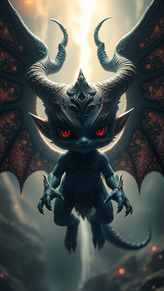 A mesmerizing creature with an irresistibly adorable appearance, yet possessing a wickedly sinister soul, set against the backdrop of a cosmic struggle between light and dark. The visuals blend the themes of good and evil in a stunningly detailed style, combining elements of demonangel and white witchcraft with an ethereal luminosity. The background suggests an endless fall, evoking a sense of fallingcore, while the hyper-realistic details are captured in breathtaking clarity. The composition is stunningly emotional and hyper-detailed, capturing epic cinematic lighting. Rendered in 32k UHD resolution, the scene is brought to life by Daz3d and DamShelma, with creative touches that enhance its captivating allure.