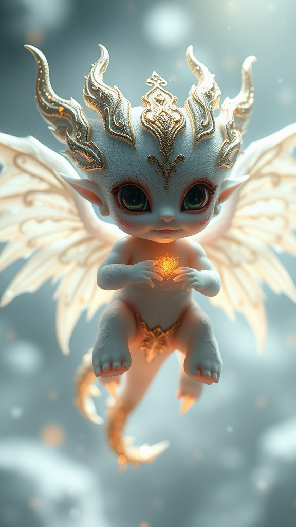 A mesmerizing creature with an irresistibly cute and enchanting appearance hides a nefariously wicked soul, contrasting themes of purity and malevolence, depicted in the demonangel stripcore style. The creature is adorned in ethereal white and shimmering gold tones, set against a luminous background that enhances its dual nature. It appears to be plummeting from the heavens, embodying the essence of fallingcore. The artwork is hyper-realistic and meticulously detailed, with a breathtaking composition that evokes deep emotional resonance. The scene is illuminated by epic cinematic lighting, rendered in 32k UHD resolution, crafted by daz3d, capturing the tension between good and evil in an awe-inspiring visual narrative.