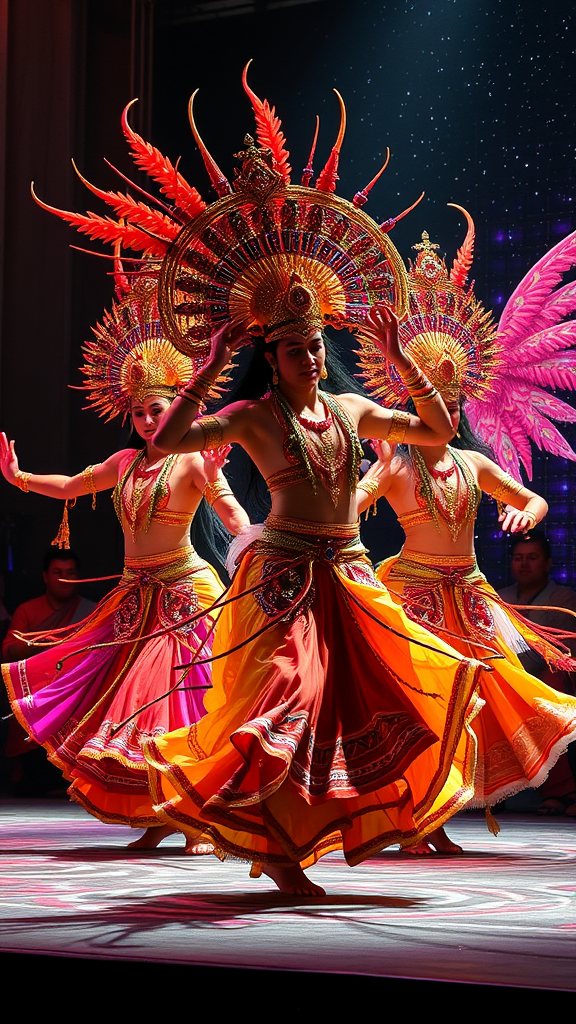 A mesmerizing dance unfolds in a vibrant display of colors and elaborate costumes, where performers embody divine spirits through intricate rituals, invoking ancient tales and celestial energies in a transcendent celebration of cultural and spiritual heritage.