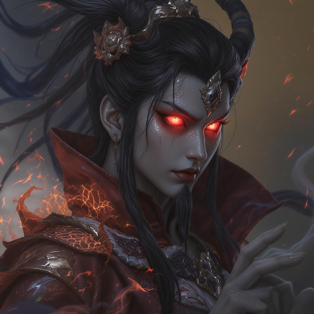 A mesmerizing depiction of a Chinese character adorned in a fiery costume, glowing red eyes piercing through the ambiance. Captured in a realistic hyper-detailed portrait style, the character emanates a blend of dark bronze and light blue hues. Employing digital airbrushing techniques to craft fantastical otherworldly visions, the piece showcases luminous 3D objects skillfully integrated into the scene. The portrayal embraces an intricate level of detail, highlighting the character's elaborate attire and fierce expression. Despite elements of distortion and surrealism, such as extra limbs or mismatched features, the composition invites intrigue and contemplation. The background remains simple to draw focus on the character, employing a mix of intentional imperfections like blurred textures and fanciful anatomy, adding to its ethereal charm.
