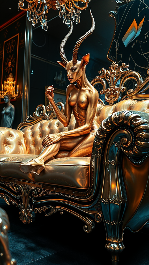A mesmerizing depiction of a woman-gazelle hybrid, elegantly poised on a massive, opulent couch crafted from liquid shiny metal and translucent crystal. The scene is beautifully illuminated, capturing the essence of an Artgerm-style dynamic and action-packed atmosphere. Exquisite brushwork highlights every curve and detail, drawing influences from stripcore and crystalpunk aesthetics. The image is rich with blink-and-you-miss-it intricacies, a visual symphony inspired by the stunning concept art of Alberto Vargas and Boris Vallejo. Her graceful form is a captivating blend of strength and elegance, embodying a mythical allure in a surreal, luxurious setting.