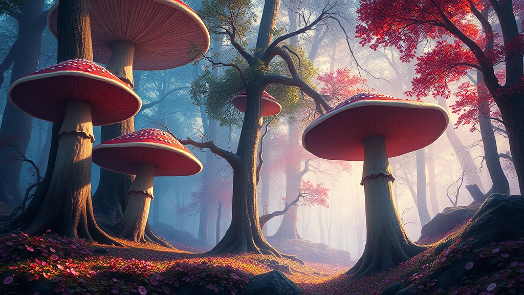 A mesmerizing depiction of an enchanted forest, where ethereal light bathes the landscape in a kaleidoscope of vibrant colors. Towering mushroom trees cast delicate shadows across the forest floor, their intricate textures capturing the eye with exquisite detail. The ambiance is one of serene magic, as if the scene were rendered in unreal engine 5 with ultra-high-definition resolution. Inspired by the imaginative spirit of Vincent Van Gogh, the painting's rich colors and dynamic brushwork bring a surreal quality to life, as if the forest itself breathes with an otherworldly presence.