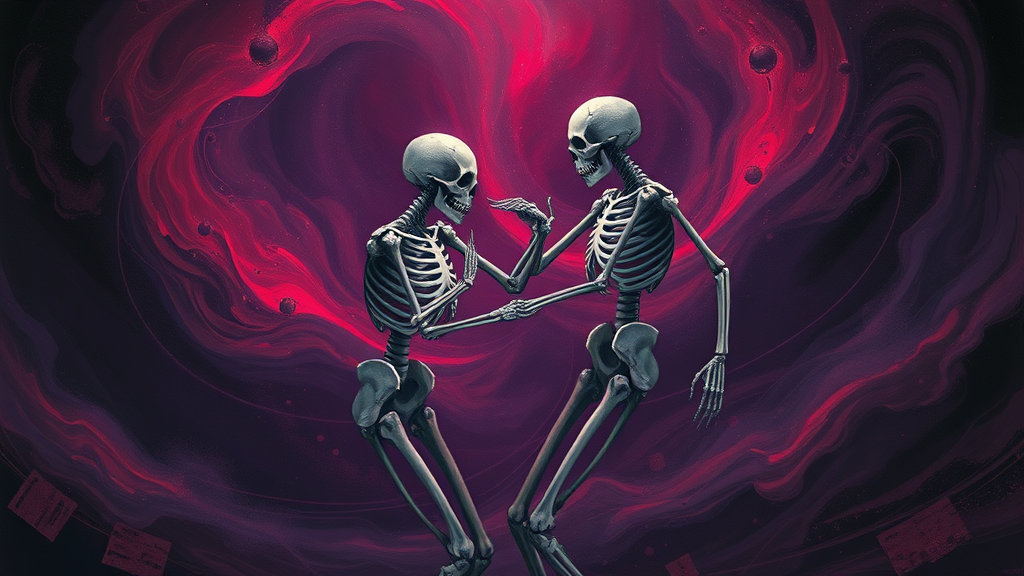 A mesmerizing depiction of skeletons entwined in a dance of celestial elegance, set against a backdrop of swirling dark purple and deep red hues. This fantasy artwork channels the style of Magali Villeneuve with a celestialpunk twist, embodying a dark and brooding atmosphere. The scene is intricately detailed, capturing the ethereal beauty and haunting allure of the celestial realm. The artwork echoes the hyper-realistic detail of Zacharias Martin Aagaard, blending realism with imaginative fantasy elements to create an immersive visual experience.