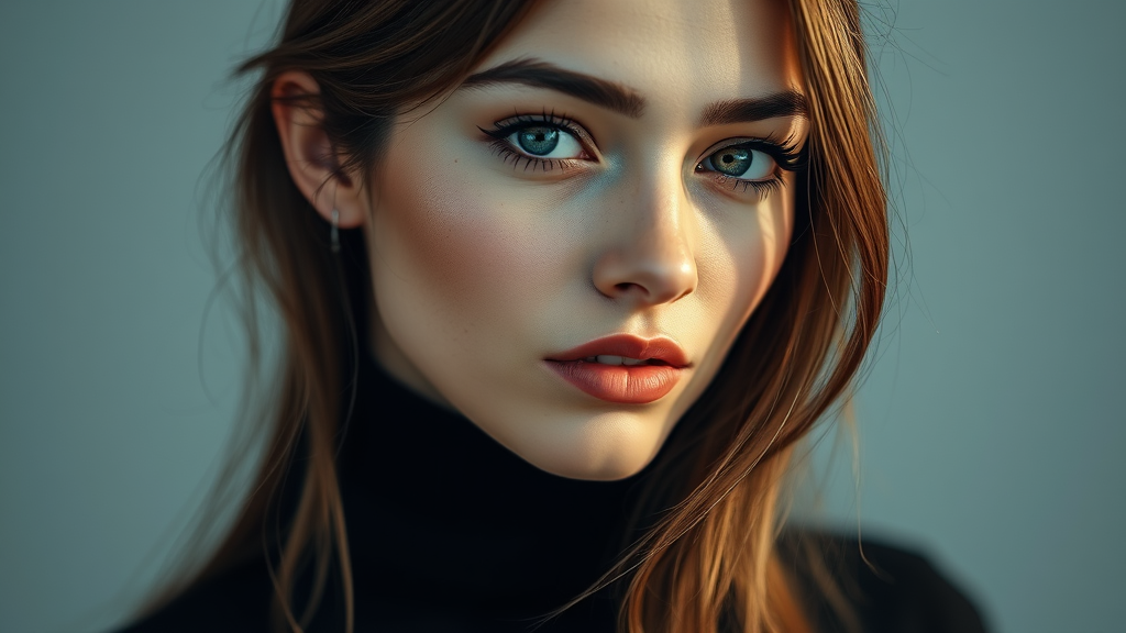 A mesmerizing detailed full-color portrait of a captivating woman in a black turtleneck, styled in an epic character composition, inspired by the works of Ilya Kuvshinov, Alessio Albi, and Nina Masic. Rendered with sharp focus and natural lighting, featuring subsurface scattering and captured with an f2, 35mm lens. Presented with a film grain cartoon effect and subtle 3D elements, enhanced by unique, unconventional color tones for added depth, while maintaining a slight blur for artistic intrigue.
