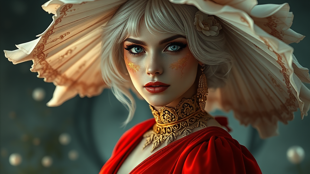 A mesmerizing digital portrait of a white-haired woman in a flowing red dress adorned with gold detailing on her face, reminiscent of the styles of Gaston Bussiere and Mucha. Her white hat, intricate and elegant, complements her ethereal appearance as she stands with confidence and grace. Her gaze, intense and captivating, reflects the masterful techniques of Tim Burton's atmospheric storytelling and the hyper-realistic detail seen in the works of Michael Whelan. The dramatic, award-winning lighting creates an atmospheric glow, enhancing her aura. Ornate golden filigree ornaments adorn her neckline, echoing the delicate beauty of her flower-crafted crown. Set against a dark fantasy backdrop, this headshot captures the essence of high fashion magazine cover art. The scene is rendered in high resolution, offering a glimpse into the lush, surreal environment where fantasy meets realism in a cinematic display.