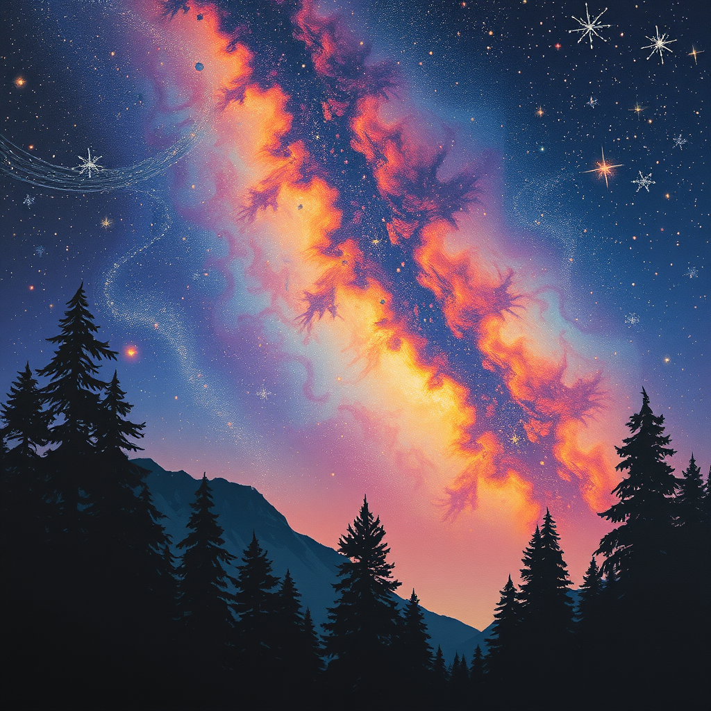 A mesmerizing evening sky filled with twinkling stars, framed by silhouetted trees, set in an intricate psychedelic landscape reminiscent of Martin Ansin and Emily Carr. The scene pulsates with psychedelic overload, revealing multilayered dimensions and swirling vortexes, all painted in a naturalistic color palette that captures the wonder of the cosmos.