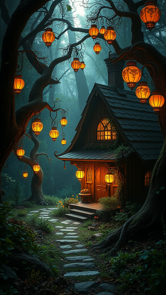 A mesmerizing fairy tale wonderland nestled within an enchanting forest where nature flourishes in wild abundance, surrounding a quaint magical cottage at its heart. The setting is shrouded in a serene darkness that heightens the glow of the warmly lit house, casting pools of soft illumination from vibrant lanterns hanging from ancient branches. This symmetrical vista reveals an incredibly detailed wooden house, intricately carved with whimsical patterns and adorned with delicate vines, creating an atmosphere of awe and wonder. The scene is breathtakingly beautiful, with maximum attention to detail, capturing the delicate interplay of light and shadow. Soft blooms of light rays pierce through the canopy, while the ambient occlusion accentuates the textures of the environment. This photorealistic, cinematic shot conveys a raw and enchanting moment, offering a glimpse into a magical world where tranquility and mystery coexist.