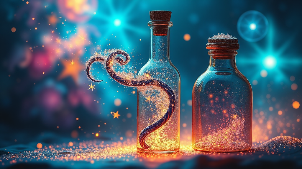 A mesmerizing fantasy artwork featuring an intricately detailed bottle filled with delicate magical fairy dust, emanating cosmic energy in a highly detailed and deep-colored painting. The image showcases fantastical and intricate details, utilizing complementary colors and capturing the essence of fantasy concept art. The scene is reminiscent of trending Artstation and Unreal Engine 5 visuals, inspired by anime and Japanese manga. The piece channels a hyperrealistic vibe, akin to splash and concept art, with a mid-shot focus. The artwork features a 2/3 face angle and dramatic side lighting, set against a vibrant and colorful background, reminiscent of SAI pixel art.