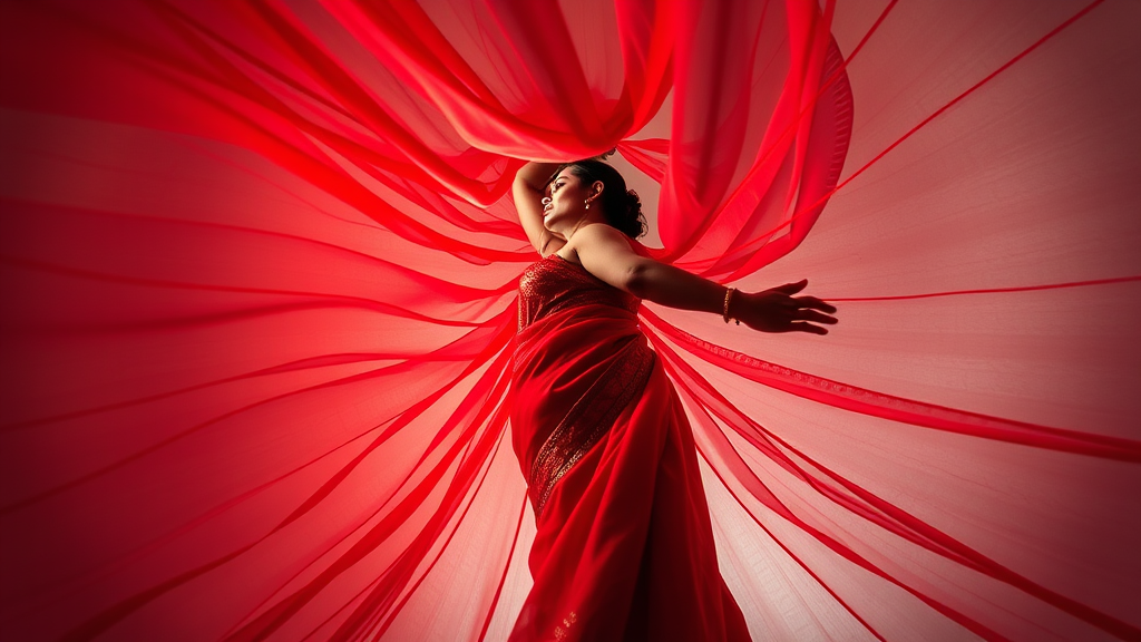 A mesmerizing fashion photograph captures a stunning 45-year-old Indian woman in a dynamic "bug's-eye view." She gracefully wears a vibrant, flowing red traditional Saree that cascades around her, billowing outward in all directions to create a dramatic visual spectacle. The full body shot is taken from a low vantage point, offering a side view with the camera angled steeply upwards, emphasizing the majestic fabric and the woman's elegant form. The extreme-angle perspective from the floor up includes her poised head in the frame, weaving an enchanting narrative of grace and tradition. Delight in the interplay of light and shadow that highlights the Saree's intricate patterns, making this scene a breathtaking celebration of culture and beauty.