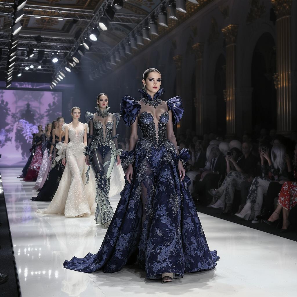 A mesmerizing fashion show unfolds as models grace the catwalk in stunning haute couture outfits, each garment showcasing exquisite details that captivate the eye. Under the glowing spotlights, every intricate stitch and fabric texture is highlighted, creating an atmosphere where the smallest elements speak volumes. The dynamic flow of the event brings attention to the artistry and precision in every piece, embodying the essence of innovation and luxury.