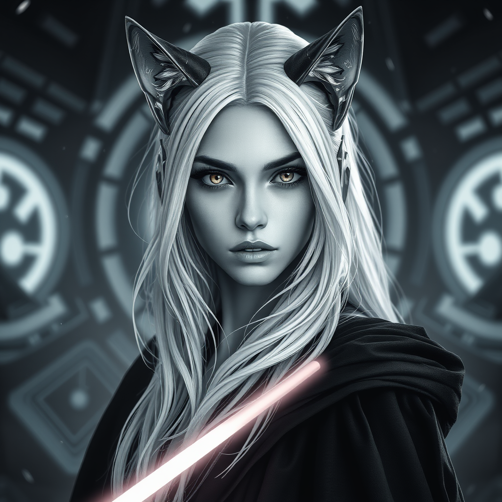 A mesmerizing female Sith Lord with striking white hair and elegant cat ears, showcasing a captivating and hyperdetailed face that captures attention. Set in a dynamic pose within an immersive Star Wars-inspired background, this grayscale masterpiece offers a depth of field that draws you in. The artwork, rendered in 8k resolution, combines elements of mystique and power, while maintaining the essence of the dark side. Adjustments in anatomy and artistic expression enhance the overall composition, ensuring a flawless representation of this enigmatic character.