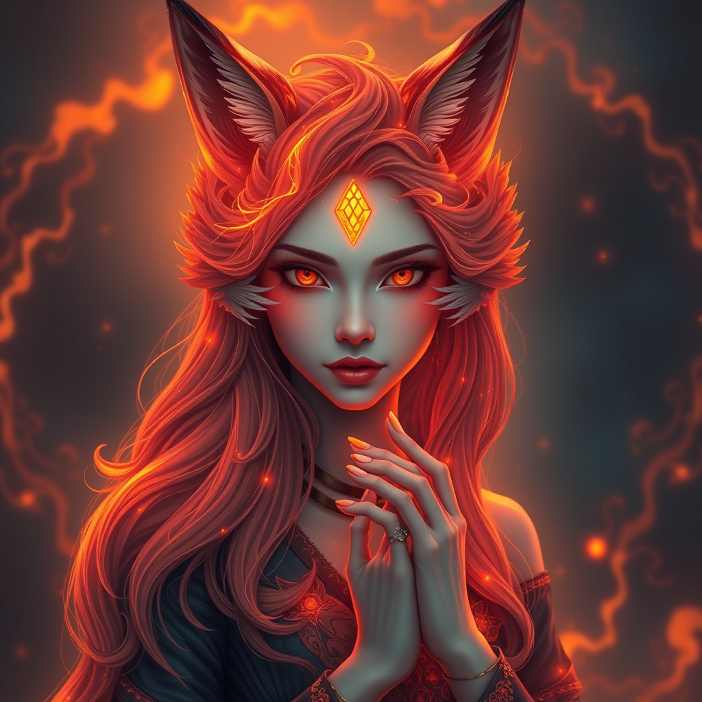 A mesmerizing full-body portrait of a fox maiden composed of molten magma and glowing lava, exuding an ethereal radiance and skillfully echoing the style of Charlie Bowater, with a captivating volumetric atmosphere. Executed with impeccable quality, the artwork displays a sharp focus with an elegant visage and graceful hands. High-resolution and vibrant, the piece is intricately detailed, showcasing breathtaking and precise line art. It embodies a comprehensive cinematic quality, maxing out detail in 4k UHD digital art, capturing the essence of an award-winning, trending ArtStation masterpiece. The dynamic pose enhances the artwork's allure, ensuring clarity without distractions such as low resolution, text errors, or anatomical inaccuracies.