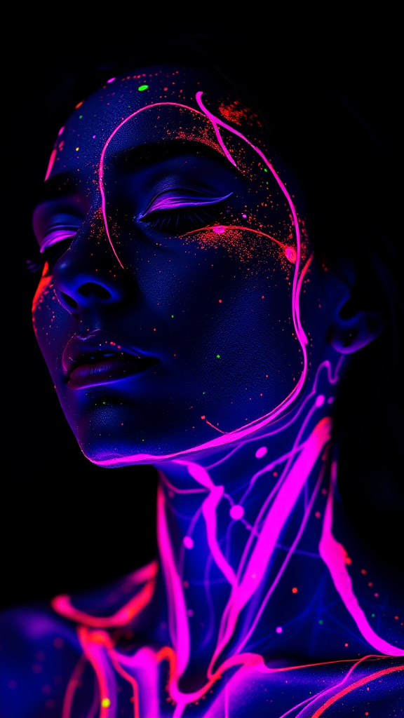 A mesmerizing full-body portrait showcases a woman enveloped in vibrant neon fluorescent paint that glows brilliantly under UV blacklight. Her eyes are softly closed, exuding a serene and tranquil expression as vivid colors—pinks, purples, oranges, and blues—dance artistically across her skin. The glowing paint forms intricate abstract patterns over her face, neck, and shoulders, with neon specks and streaks amplifying the ethereal ambiance. The dramatic, minimal lighting casts the UV-illuminated colors into sharp relief against a pitch-black background, creating a striking contrast that enhances the paint's surreal luminescence. This detailed texture captures the sharpness of the vibrant paint while soft lighting gracefully highlights the contours of her face, creating a delicate interplay of light and shadow. The overall atmosphere is artistic, futuristic, and captivating, focusing on the stunning fluorescent hues and the woman's serene expression in this otherworldly scene.