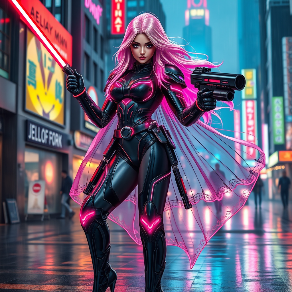 A mesmerizing full-body shot of a futuristic female warrior in astonishing detail, set in an urban cyberpunk cityscape. She dons sleek sci-fi armor adorned with mesmerizing, pulsating neon lights that complement her multi-colored, glowing hair flowing in the rain. Her eyes, large and captivating, exude confidence and readiness for battle as she wields a laser saber in one hand and a sci-fi gun in the other. Her outfit, crafted from high-gloss latex, accentuates her form, with high-heeled boots adding to her imposing presence. A transparent cape, shimmering with reflections and intricate designs, cascades behind her. Her face, an epitome of beauty with photo-realistic detail, carries a confident smile, enhanced by the nostalgic, dramatic ambiance of a cyberpunk city bathed in neon lights. This vivid artwork draws inspiration from the majestic styles of Ed Binkley, Atey Ghailan, and the imaginative worlds of Studio Ghibli, as well as the artistry of Jeremy Mann, Gregory Manchess, and Antonio Moro. It is a testament to intricate high-detail craftsmanship, beautifully trending on platforms like ArtStation and CGSociety.