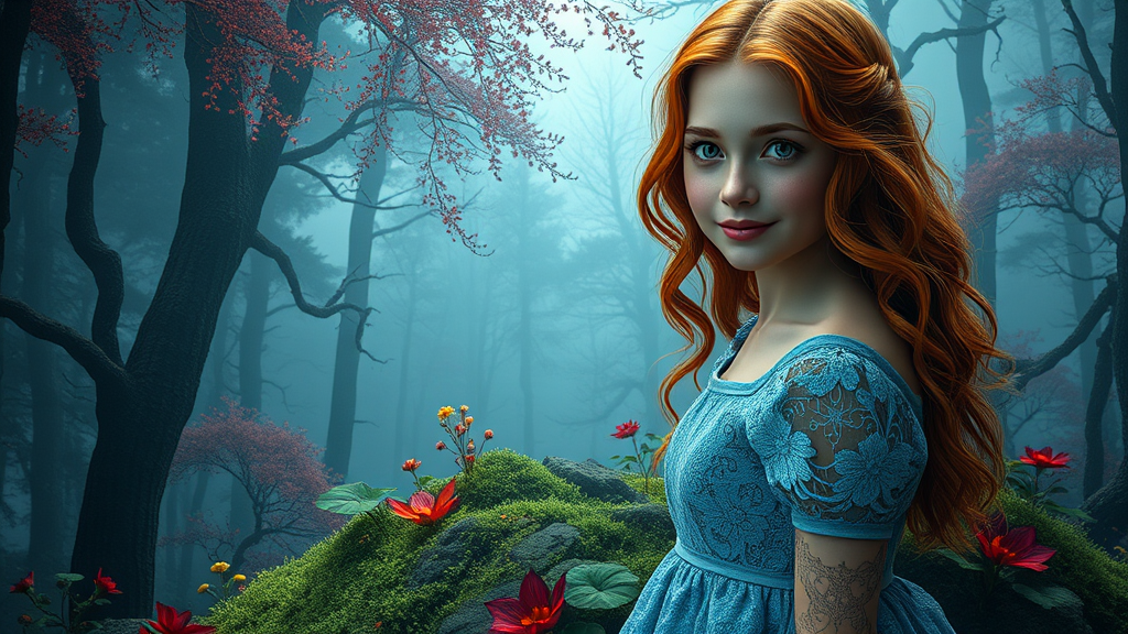 A mesmerizing fusion of a mystical fantasy forest and the infernal realms echoes Dante's vision. At the scene's heart stands a captivating portrait of an enchanting Nordic red-haired girl, her features delicate and whimsical. With a gentle smile, she stands poised, her delicate feet gracing the summit of a lush hill. Her blue lace dress flows gracefully, accentuating the magical surroundings. Her face is perfectly detailed, with symmetrical hazel eyes and circular irises capturing the viewer's gaze. The scene unfolds like a stunning realistic photograph, rendered with 3D finesse and octane precision, intricately detailed to cinematic effect. This hyperrealistic masterpiece captivates, trending on ArtStation and winning heads on Behance, itβs smooth and ultra-high definition, rendered in 8K with the power of Unreal Engine 5. Inspired by the styles of Mucha, Klimt, and Erte, the artwork is both vibrant and gritty, exuding an ominous yet epic aura. The detail and vibrancy echo the likes of Tanvir Tamim and Artgerm, foreshadowing Giger and Beksinski's surreal intricacies. The result is a breathtaking piece with sharp focus and ultra-sharp clarity, a triumphant contest winner where fantasy meets the infernal in a beautifully stylized digital artwork.
