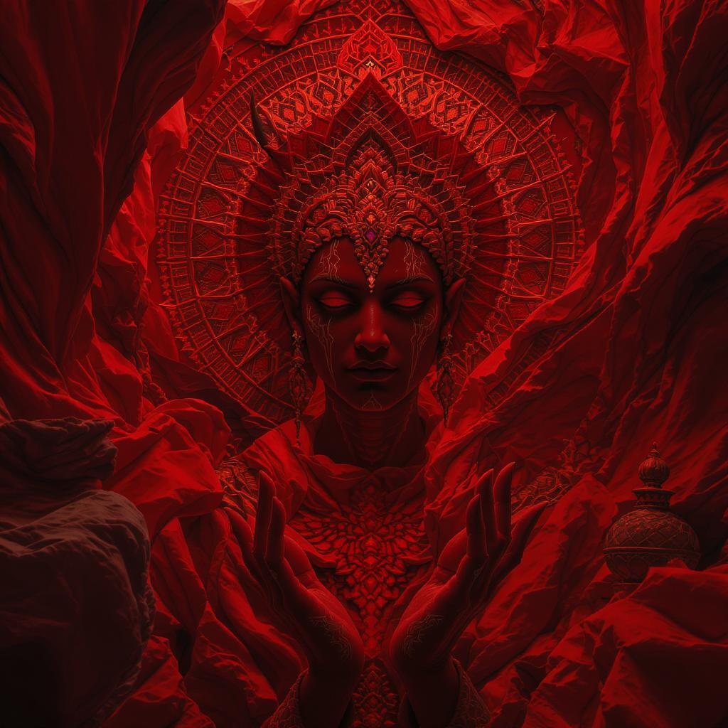 A mesmerizing fusion of digital art magic and Indonesian artistic traditions, featuring illusionary paintings with rich symbolism. This hyper-realistic, hyper-detailed masterpiece is dominated by vibrant red tones and set within a surreal 4D dimension. The ultra-detailed composition is rendered with the highest quality, resulting in an ultra-realistic, cinematic marvel that stretches across a 9:21 aspect ratio, invoking awe and wonder with every glance.