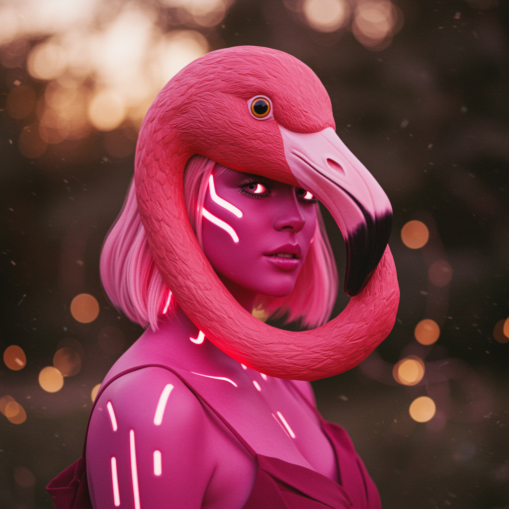 A mesmerizing girl adorned with luminescent pink skin implants, wearing an exquisitely detailed flamingo mask that radiates elegance. Her presence is complemented by a dreamlike, ethereal background that seems to shift and shimmer, capturing a sense of wonder. Created in the style of a collaborative masterpiece by Miho Hirano, Neimy Kanani, and Hsiao Ron Cheng, she stands in the golden hour's soft embrace, where every detail becomes vivid and bokeh lights dance around like ethereal creatures. Subtle enhancements bring out the intricate artistry in her expression and attire, adding a touch of fantasy to the enchanting scene.